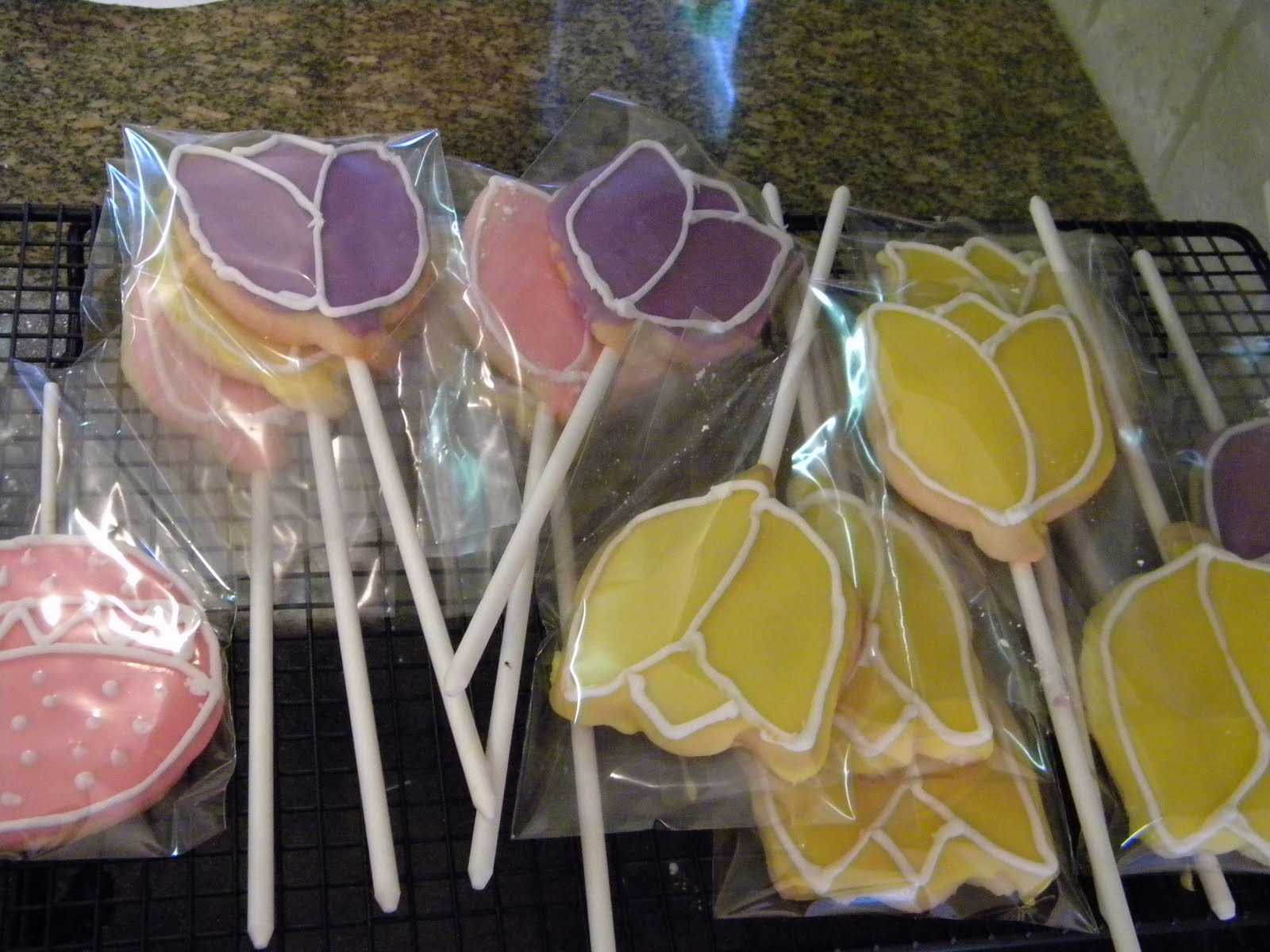 I made sugar cookies in the shape of tulips using a cookie cutter and used the long cookie sucker sticks. I had never made them before so I just kind of guessed at how to do it. I cut out the dough and then put the stick on the cookie sheet and then put the tulip on the end of the stick where it was positioned halfway up the cookie. then I kind of flattened it a bit on to the stick. Then I just baked them normally.